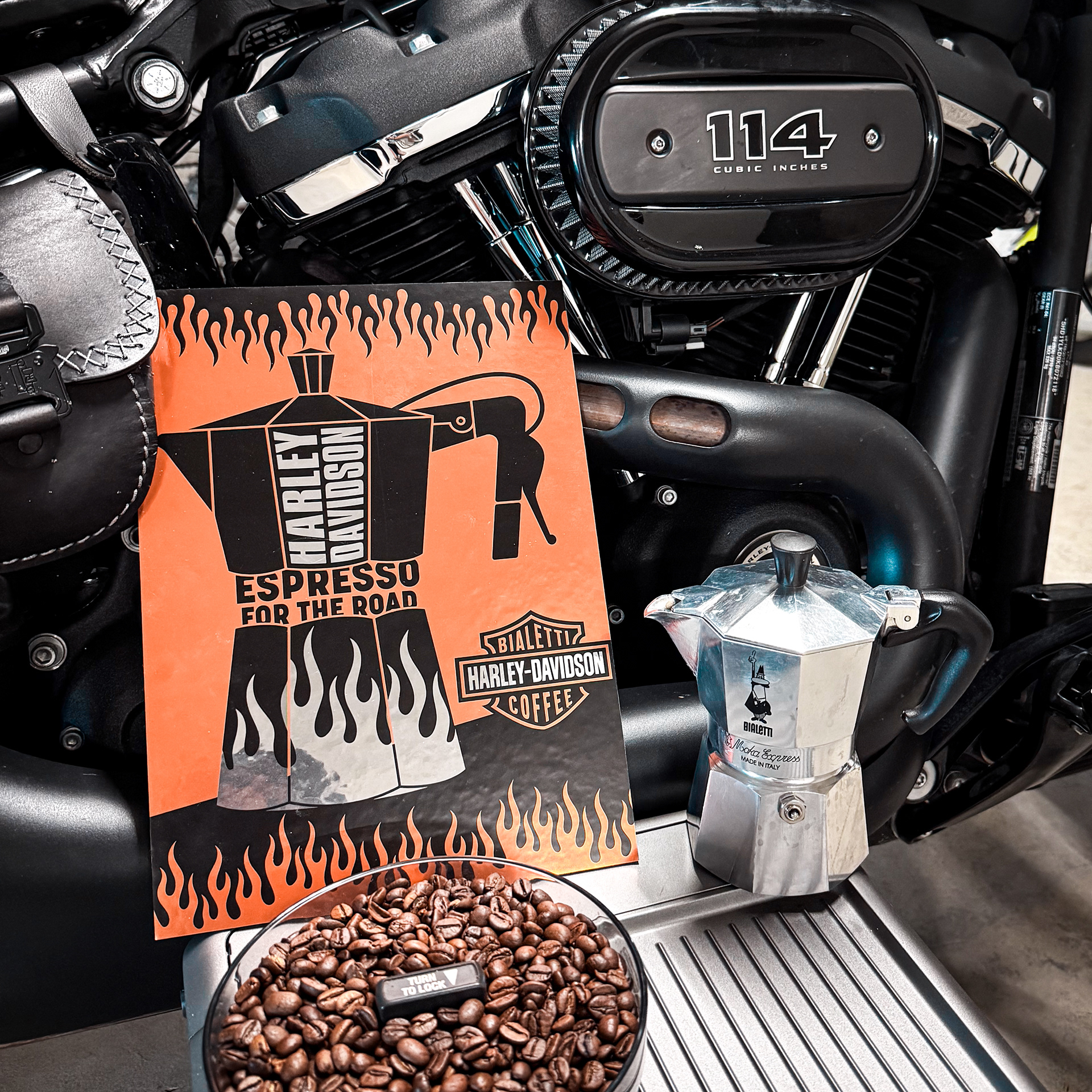 Das Design verbindet den ikonischen Look der Kaffeemaschine mit typischen Harley-Elementen.
